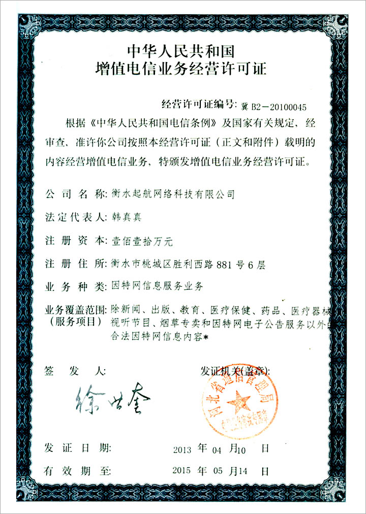 衡水起航網(wǎng)絡(luò)科技有限公司已于近日順利獲得省通信管理局頒發(fā)的增值電信業(yè)務(wù)經(jīng)營許可證,證書號碼:冀B2-20100045 。